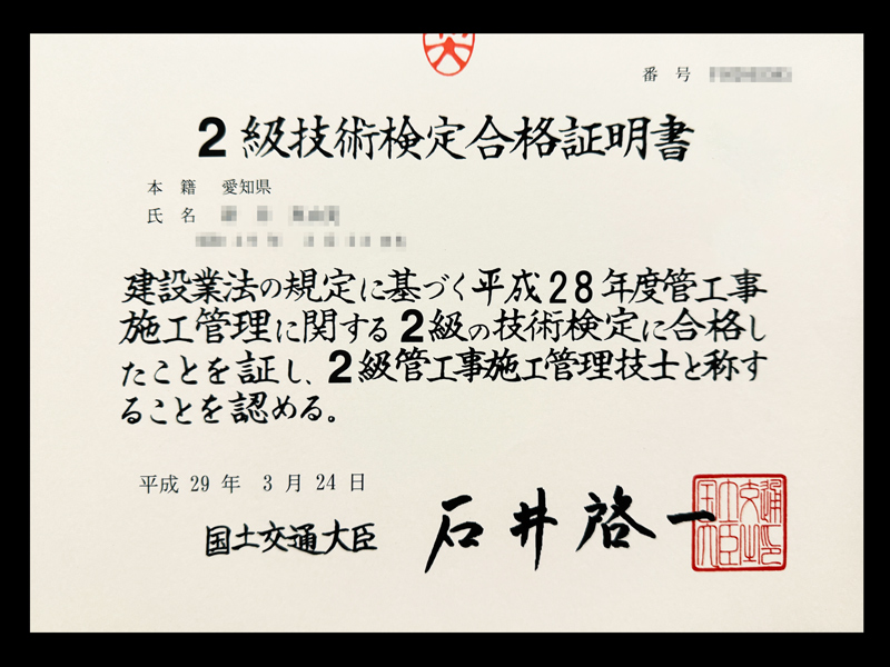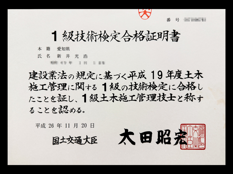 | 保有資格 | 土木施工管理技士1級 1名 土木施工管理技士2級 5名 管工事施工管理技士1級 1名 管工事施工管理技士2級 6名 建設業経理士2級 2名 建設業経理士3級 2名 給水装置工事主任技術者 2名 排水設備工事責任技術者 2名 |